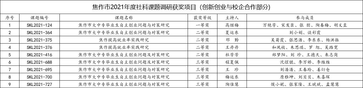 焦作市2021年度社科课题调研获奖项目(创新创业与校企合作部分)